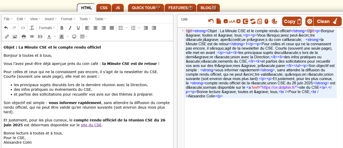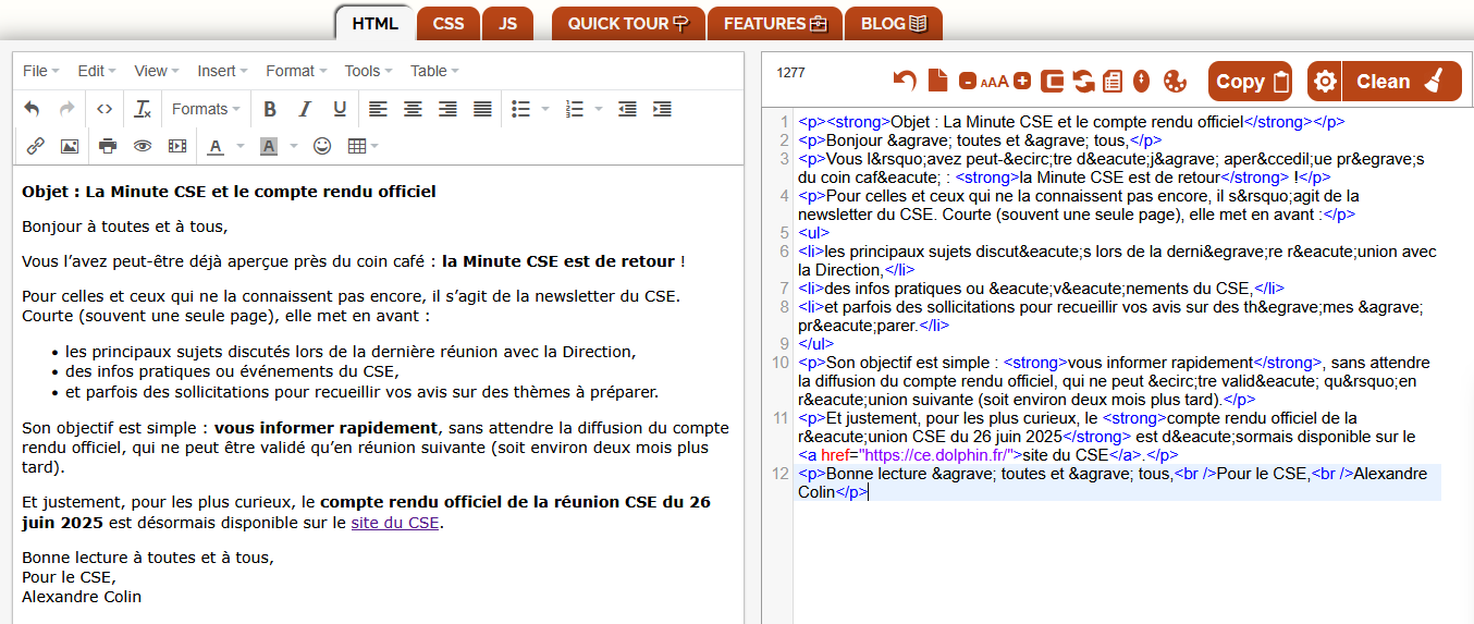 - Le HTML généré sur la droite ne doit pas être utilisé tel quel car Joomla va ajouter un retour chariot pour chaque retour à la ligne qui se trouve dans le HTML.