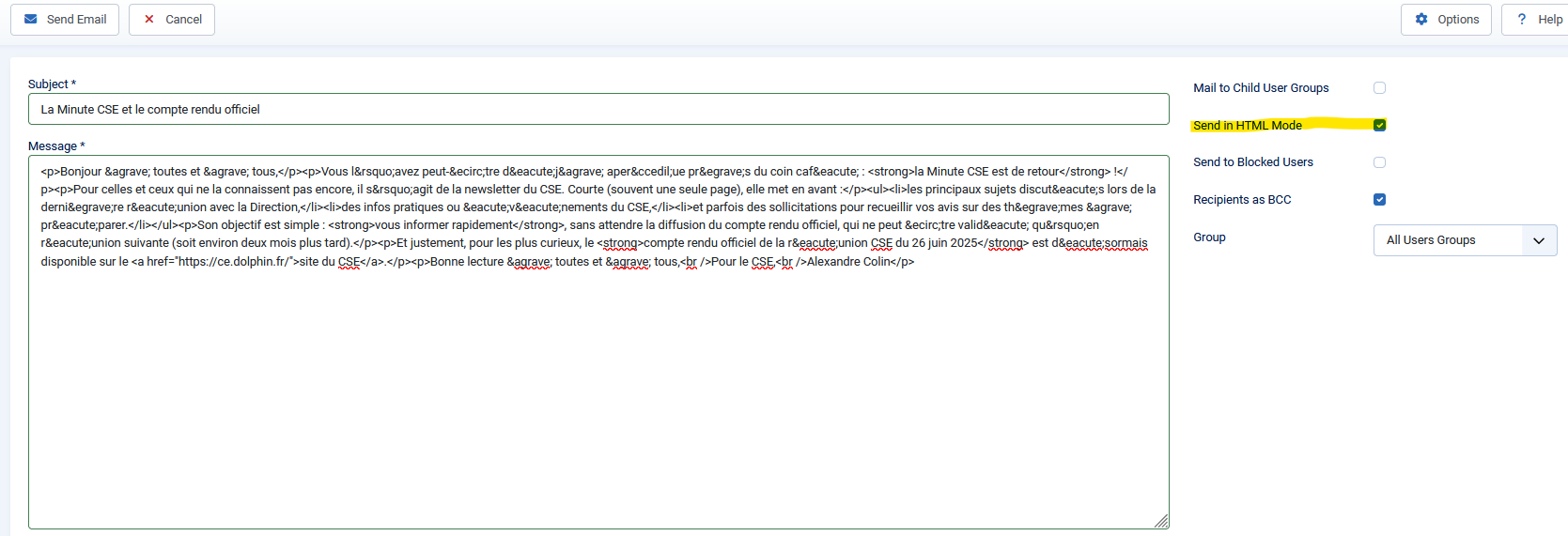 Lorsqu'on utilise le module d'envoi de mail en masse fourni par Joomla, celui est par défaut configuré en mode texte.
